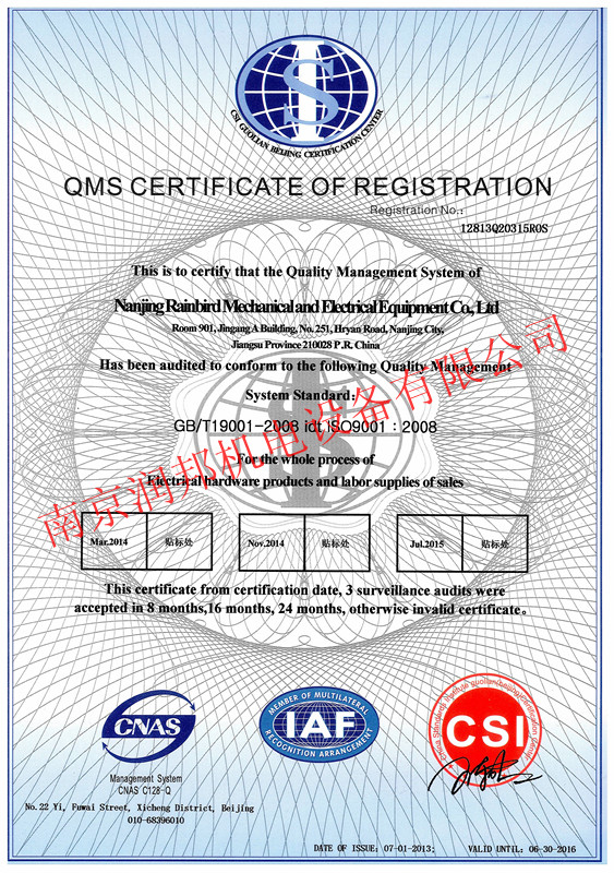 2013年7月1日,我公司順利通過ISO9001質(zhì)量管理體系認(rèn)證,并獲取以下證書: