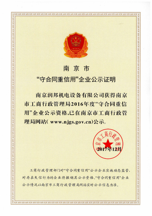 2017年12月29日,接到南京市企業(yè)信用管理協(xié)會(huì)通知,潤(rùn)邦公司再次通過2016年度市級(jí)“守合同重信用”企業(yè)的認(rèn)定。